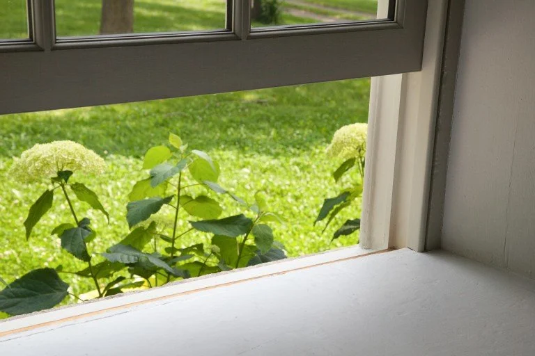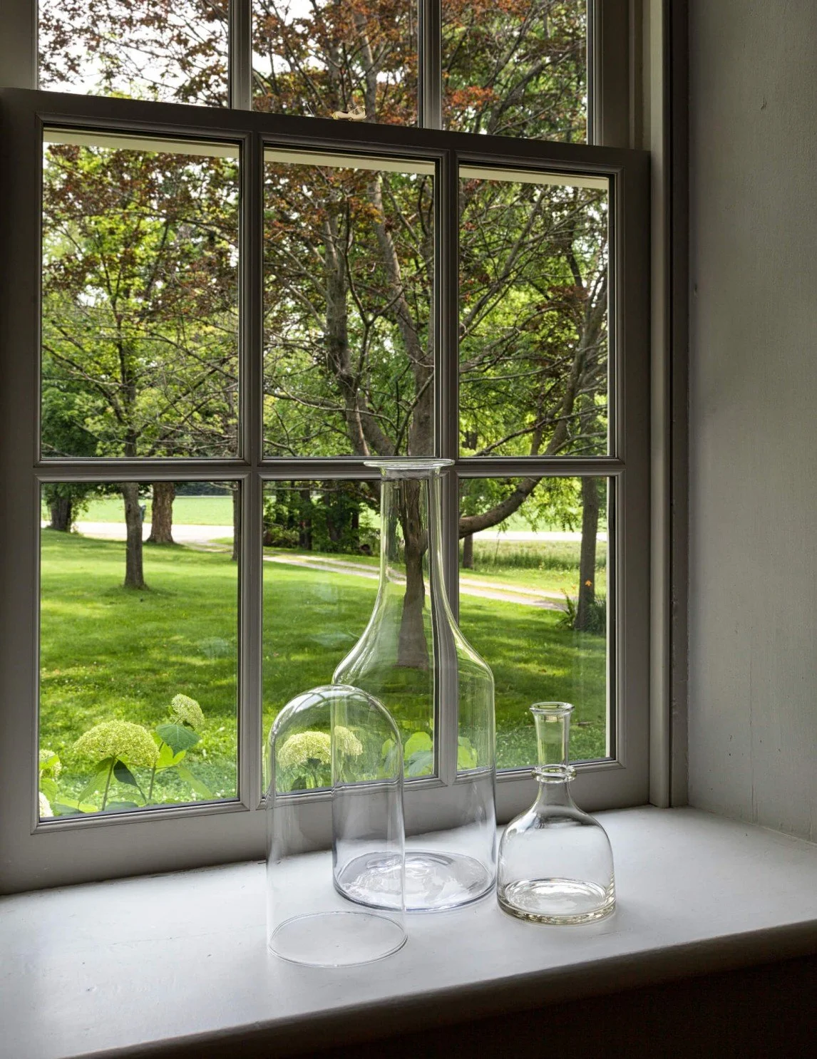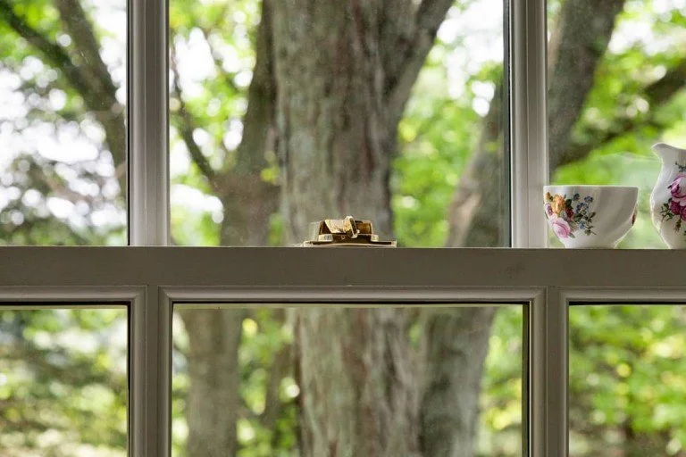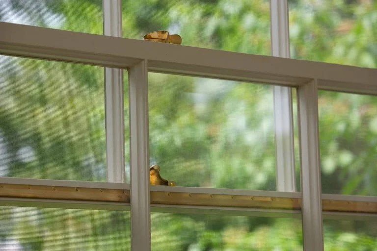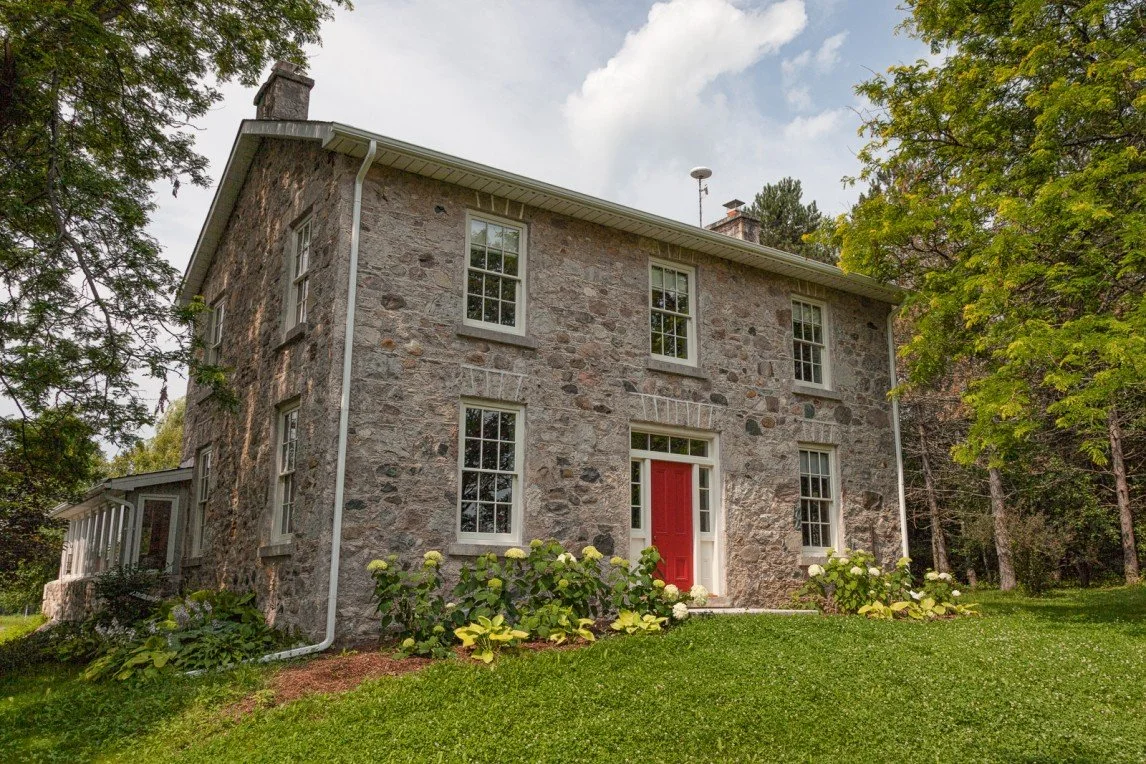 All the windows were replaced in this 1840 fieldstone Georgian-style farmhouse. Each window was restored to replicate its original style: double-hung, with six over six panes and the original moulding profile. Finish details include bronze weatherstripping and hardware sourced from the original era. The restored front door and frame complete the historic look of the house.