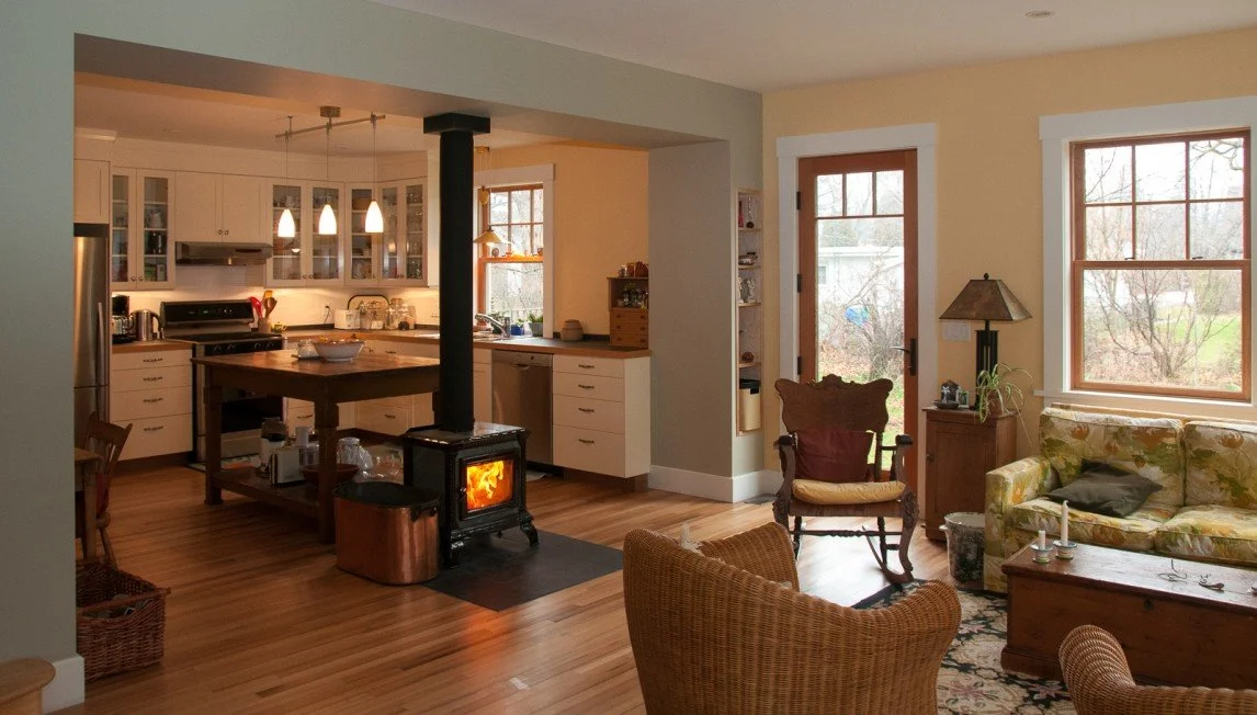 A contemporary take on an old-world New England aesthetic. This modern home features finely-crafted fit and finish but at every turn you see old-world flair and quirkiness. The living space is designed around the warmth and comfort of a wood burning stove in the kitchen and living room.