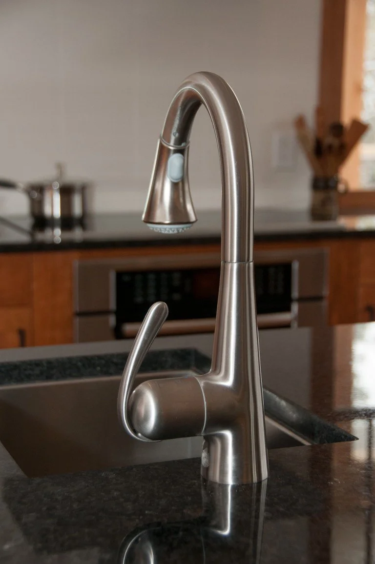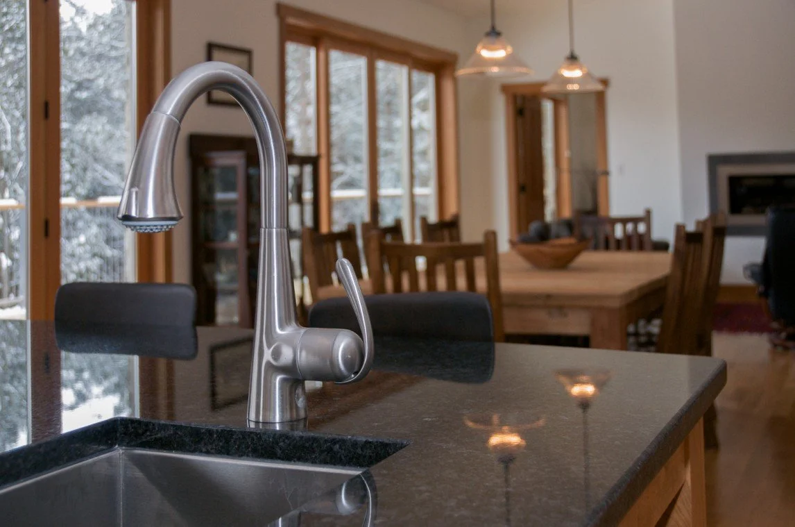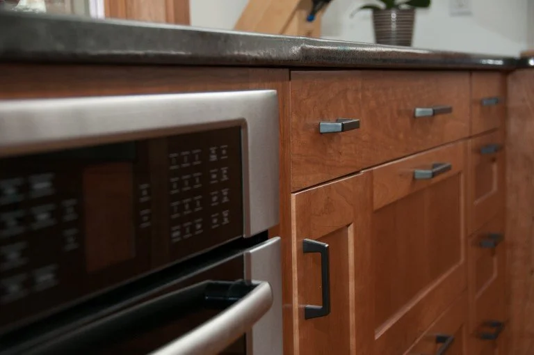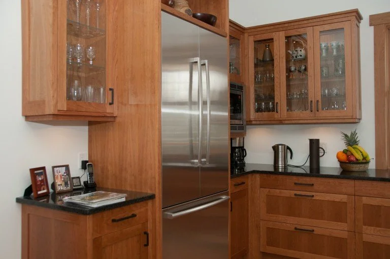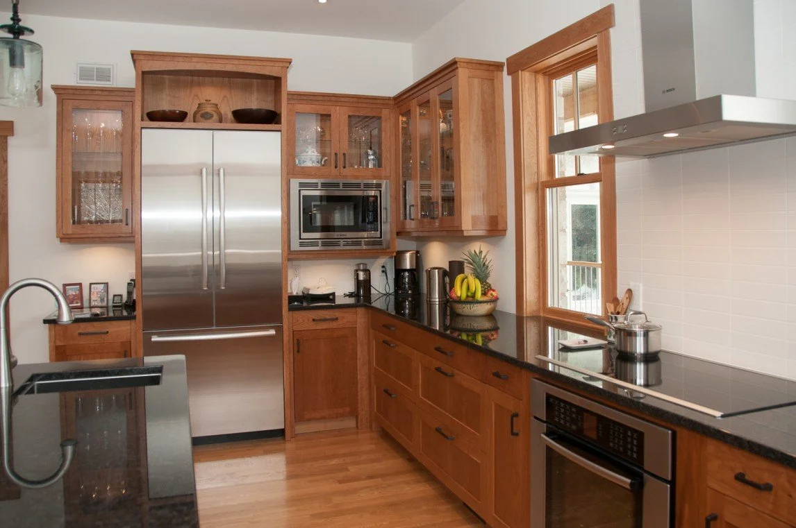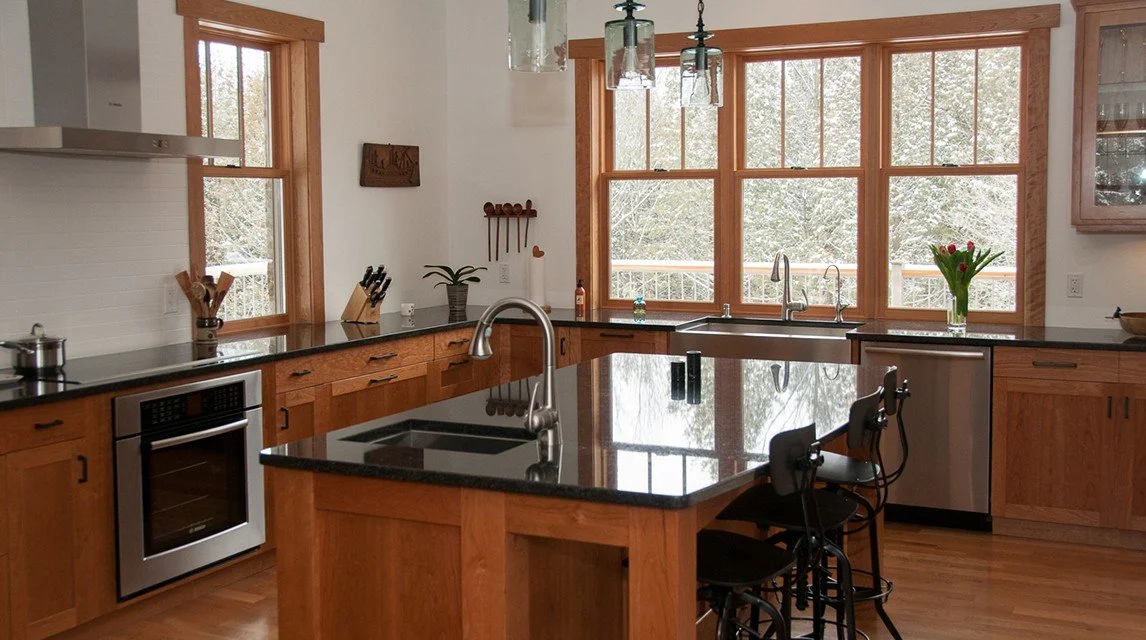 This Scandinavian style kitchen is the focal point of a new house build. Maximum counter space and minimum upper cabinets allow for large windows and lots of light to brighten the kitchen. The design features a stunning contrast between the black granite countertops and the cherry cabinets with custom woodworking throughout. Stainless appliances and farm sink give the kitchen a modern touch.