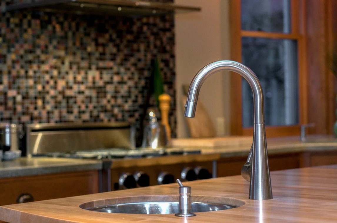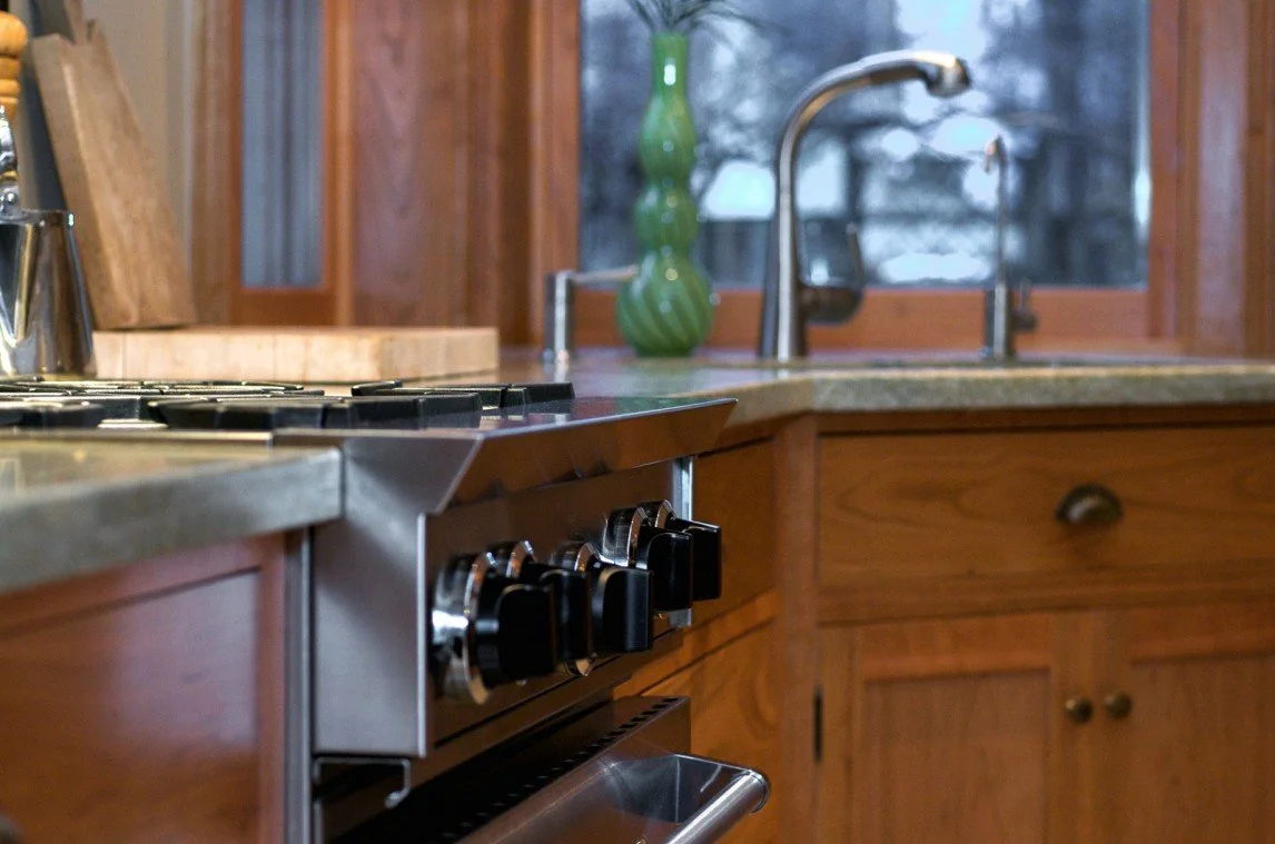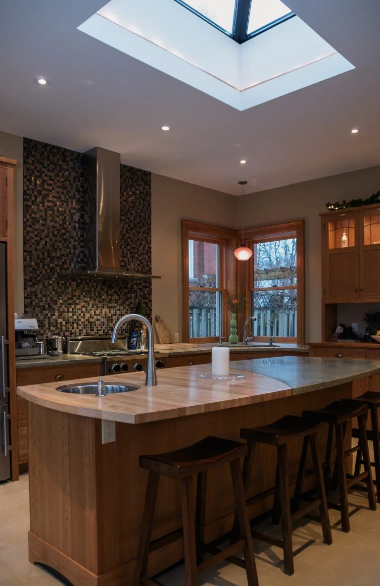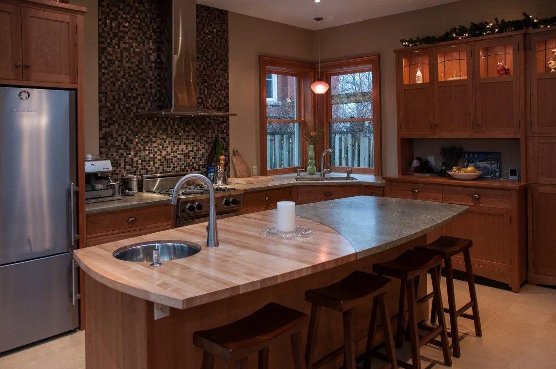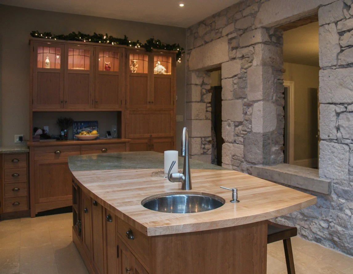 The modern kitchen was built as an addition on a century home. The natural stone wall that was the exterior of the original house is a feature of exposed stone as you enter the kitchen. Fine woodworking marries seamlessly with stone and tile for a contemporary feel.