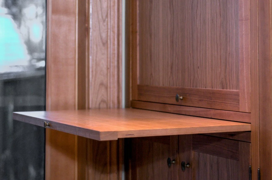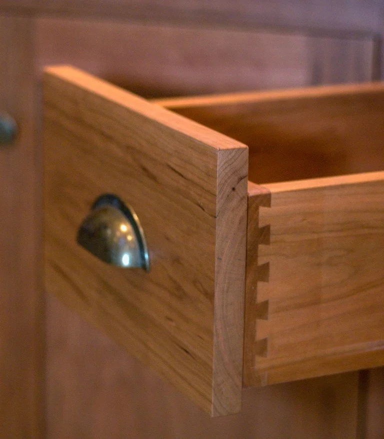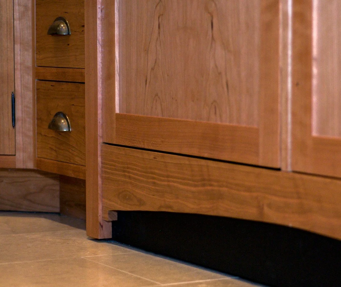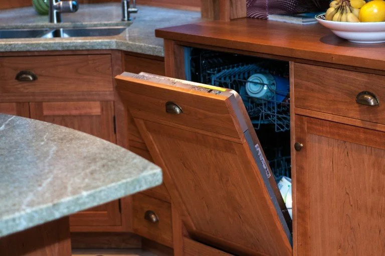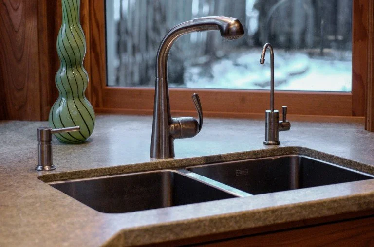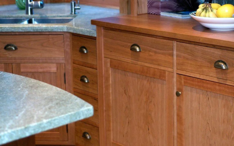 The modern kitchen was built as an addition on a century home. The natural stone wall that was the exterior of the original house is a feature of exposed stone as you enter the kitchen. Fine woodworking marries seamlessly with stone and tile for a contemporary feel.